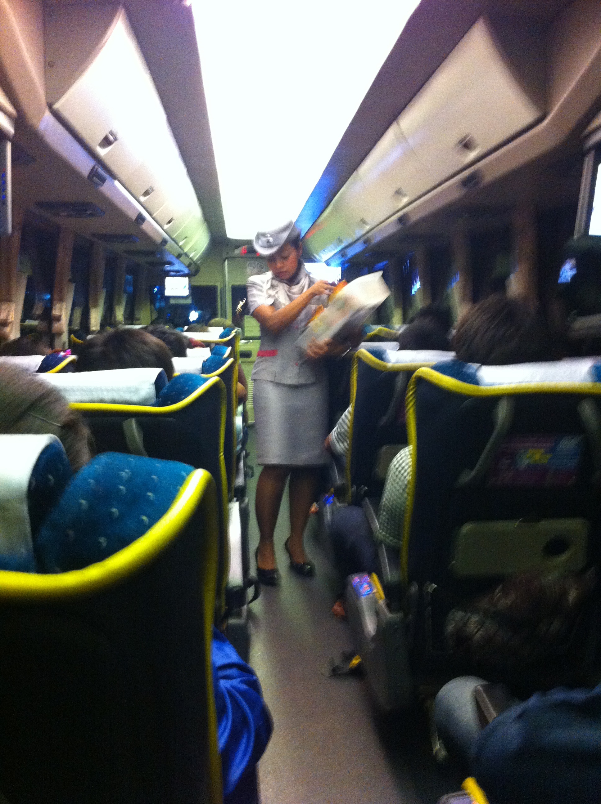A lado y lado del pasillo había dos asientos reclinables casi horizontalmente, con un pequeño reposa pies. Además la separación entre filas era mayor de lo normal. De tal manera que prácticamente podríamos viajar estirados. Y para hacer más confortable el viaje, en el reposa brazos había un menú a base de botones con los que podías elegir entre cuatro tipos de masajes diferentes y la intensidad que querías ejercer en tu asiento. No nos lo podíamos creer. Por fin un viaje nocturno y en un medio de transporte que presumiblemente iba a ser placentero. Pero aún nos aguardaban más comodidades.