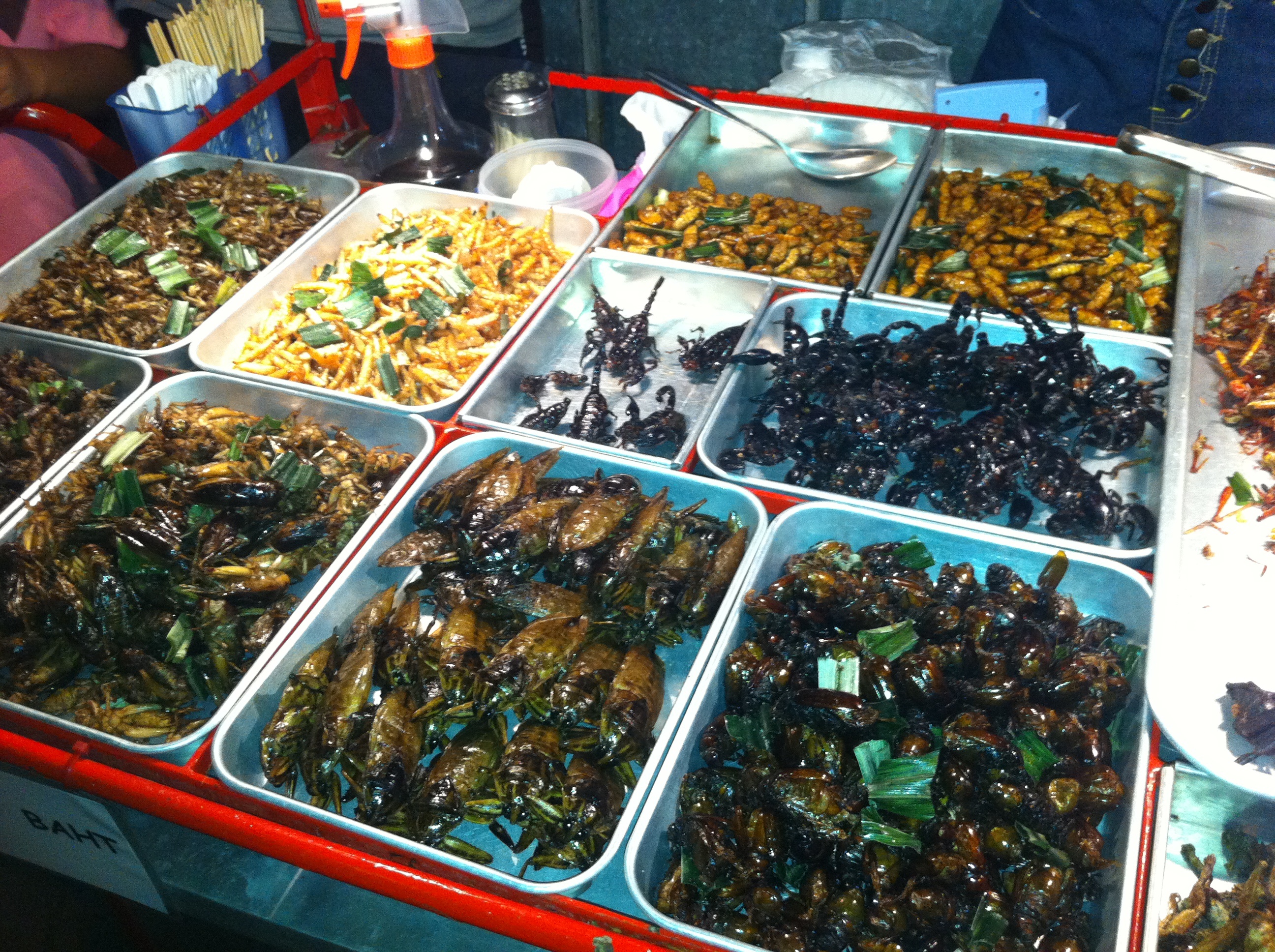 Lo habéis leído correctamente, insectos. Desde escorpiones, larvas, cucarachas de agua, saltamontes, gusanos, hasta incluso arañas. Todos estos manjares son ofrecidos adecuadamente cocinados en el mismo día y también especiados. Algunos, como los escorpiones, únicamente necesitan un poco de sal como aderezo, y ya están listos para comer. Previa separación del aguijón, claro, que es donde estos animalillos almacenan el “mortal” veneno. Otros, como la cucaracha de agua necesitan un poco de pimienta. Los saltamontes requieren una limpieza previa de alas y antenas, dependiendo si se es más o menos escrupuloso. De cualquier forma, lo más probable es que si pedimos un insecto para probar nos lo ofrezcan ensartado en un palillo. ¡Eso sí que es una verdadera tapa tailandesa!