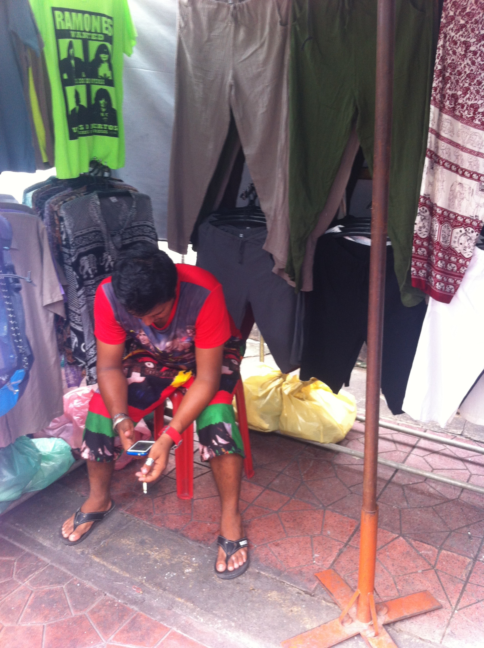 Y bajo los plásticos y las montañas de suvenires, centenares de vendedores pasan entre 12 a 14 horas diarias en el puesto, a pie de calle. El negocio pertenece a un sólo tailandés “the same boss” (el mismo dueño), como dicen ellos. Pero son personas de nacionalidad birmana las que lo defienden día a día. La birmana es la mayoría inmigrante en Tailandia. Son los desposeídos encargados de llevar a cabo los trabajos más duros: la construcción, la hostelería, o como ocurre en Khao San, obligados a seguir el juego del regateo a los turistas. Ellos, que apenas ganan entre mil y dos mil bahts al mes, -entre 25 y 50 euros-, han de poner buena cara mientras simulan un regateo que a ellos les queda lejos. Ven sacar billetes de los monederos de los viajeros que ellos tardan en reunir varios meses. A pesar de todo, y aún después de haberlos mareado con ofertas y contraofertas para después no acabar por comprarles nada, te suelen despedir con una sempiterna sonrisa.