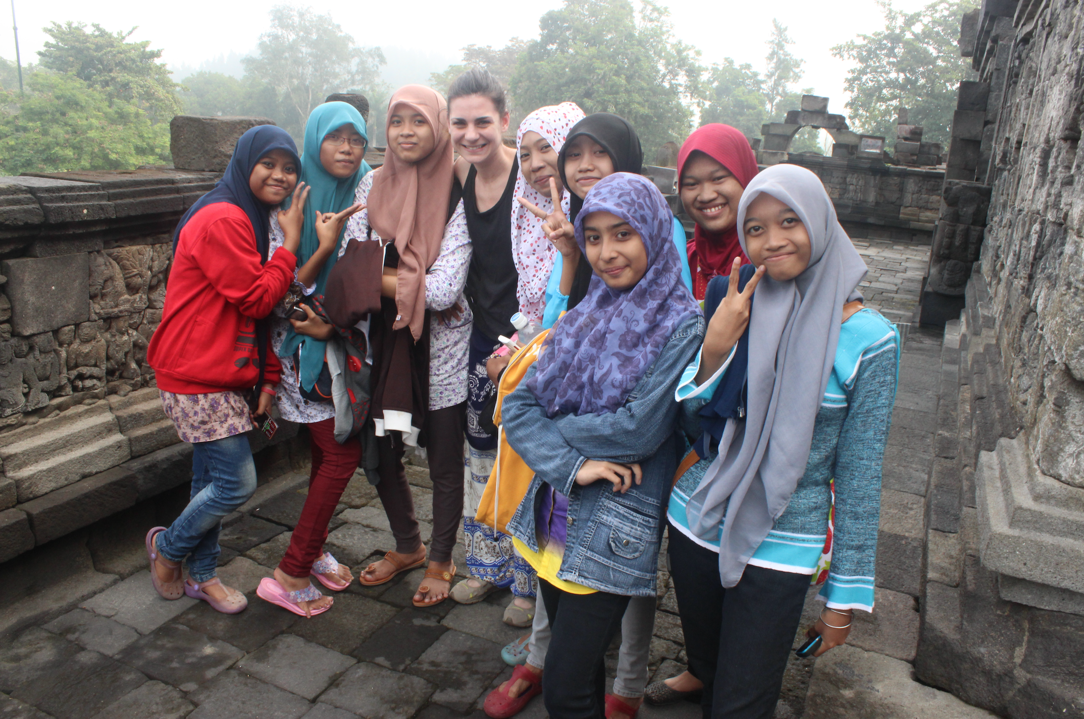 Esther experimentando el fenómeno fan entre los escolares que visitan Borobudur,