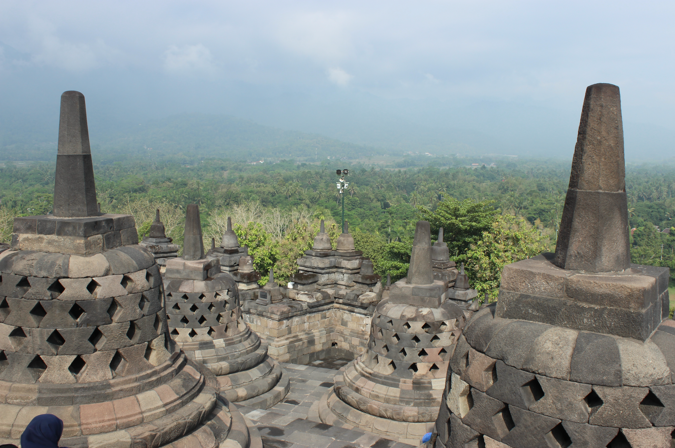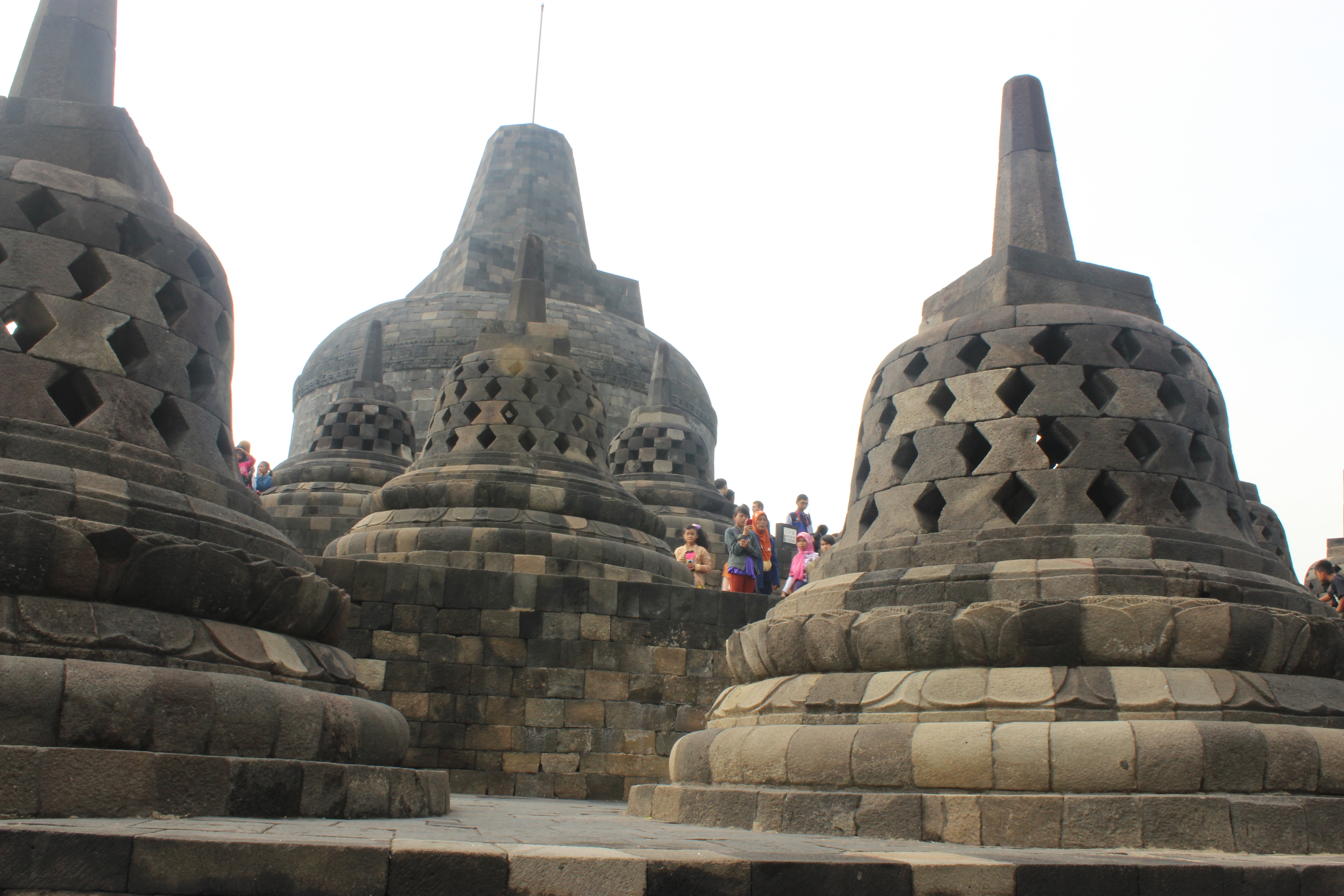 Los campos de conreo se extienden a lo lejos, cuál pedazos de tela de colores verdes, marrones y ocres. En este ambiente de postal, Atik nuestra guía, nos condujo hasta Borobudur. Quizá la mayor atracción de Yogyakarta. Un templo budista donde los libros que explican las enseñanzas se cambian por esculturas en relieve en los niveles uno y dos (Kamadhatu y Rupadhatu). Es interesante perderse a primera hora de la mañana, sobre las 8 am, para evitar las multitudes. En forma de pirámide con cuatro aristas, el visitante hace bien en empezar la ruta en la puerta, para luego ir completando cada uno de los niveles siguiendo las agujas del reloj. En el tercer nivel (Arupadhatu o Nirvana) se erige una estupa de dimensiones colosales flanqueada por decenas de otras estupas de menor tamaño. Las imágenes de buda meditando se pueden encontrar en cualquiera de los tres niveles. Aunque en el último se localizan dentro de las mismas estupas.
