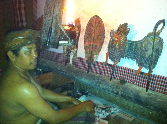 El “dalang” proyecta las sombras de cada uno de los personajes colocándolos sobre el dorso de la pantalla. La mayoría de las veces propina fuertes y sonoros golpes sobre la tensa tela, como si tratara de aplastar uno de esos molestos mosquitos que rondan todas las tardes, con un exclusivo matamoscas “de diseño balinés”. Las marionetas aparecen y desaparecen al son de un ritmo trepidante, marcado por la música pero también por un sincopado y continuado golpeo de una pieza de madera. Cada uno de estos ruidos simula un entrechocar de espadas o cualquier tipo de golpe en la trama. Así, los maestros de las “wayang kulit” logran enfatizar, siempre que la acción lo requiera, el movimiento de las marionetas dentro del marco del escenario.