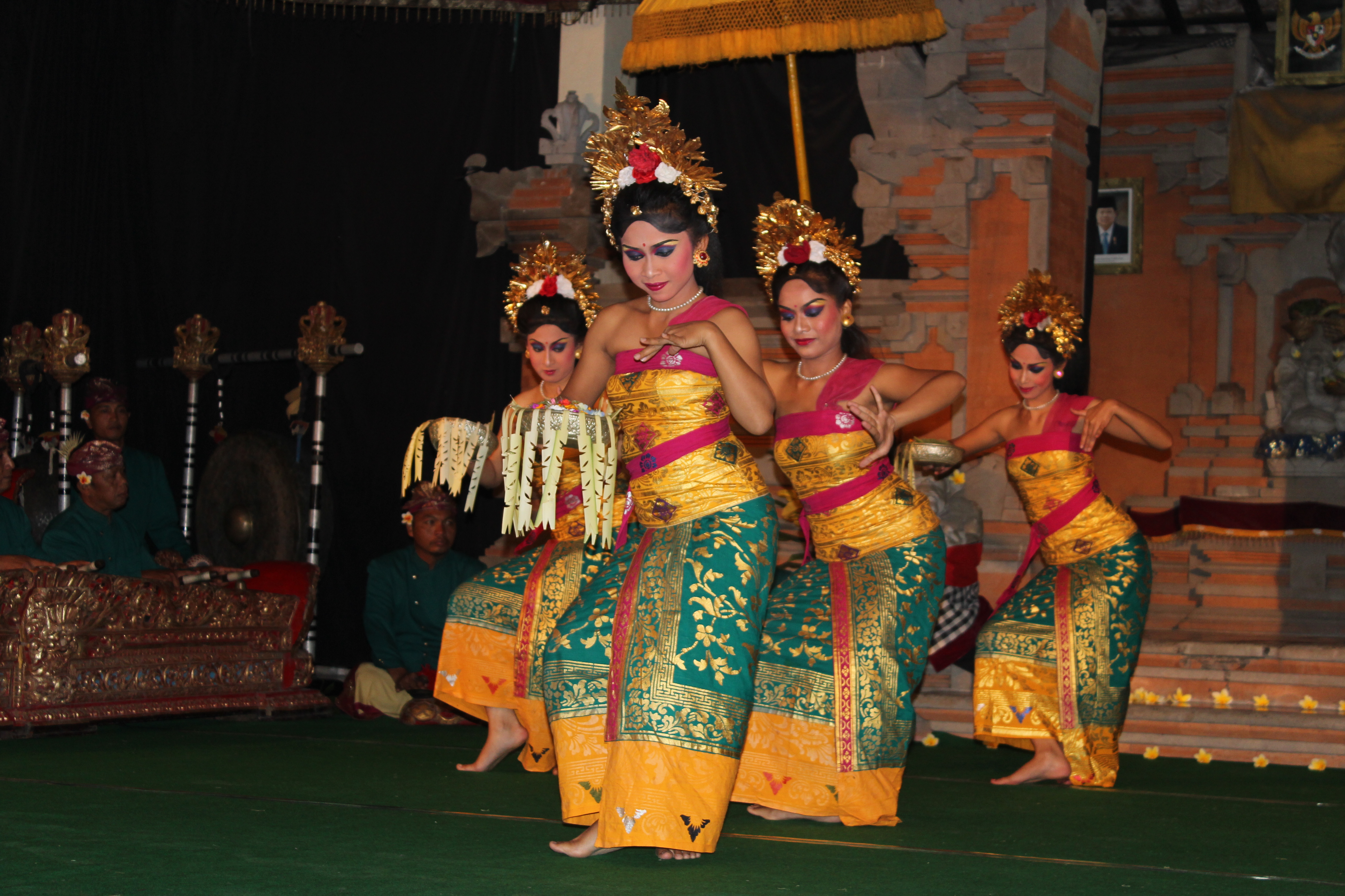 Por lo que se refiere al vestuario, tocados, sombreros y máscaras son considerados los elementos más sagrados porque la cabeza del ser humano lleva inherente esta estimación. Para las bailarinas (sobre todo en la modalidad de legong dance) el vestuario se compone de: una corona dorada tocada con flores, una camisa de media manga (aunque algunas llevan palabra de honor, dejando ver los hombros), una especie de pechera dorada (para los hombros acabada en pico, que se extiende en una pieza rectangular, que cae hasta la altura de media pantorrilla) y un pareo ricamente decorado con tonos también dorados. El pelo largo suelto o recogido en una larga melena ancha.
