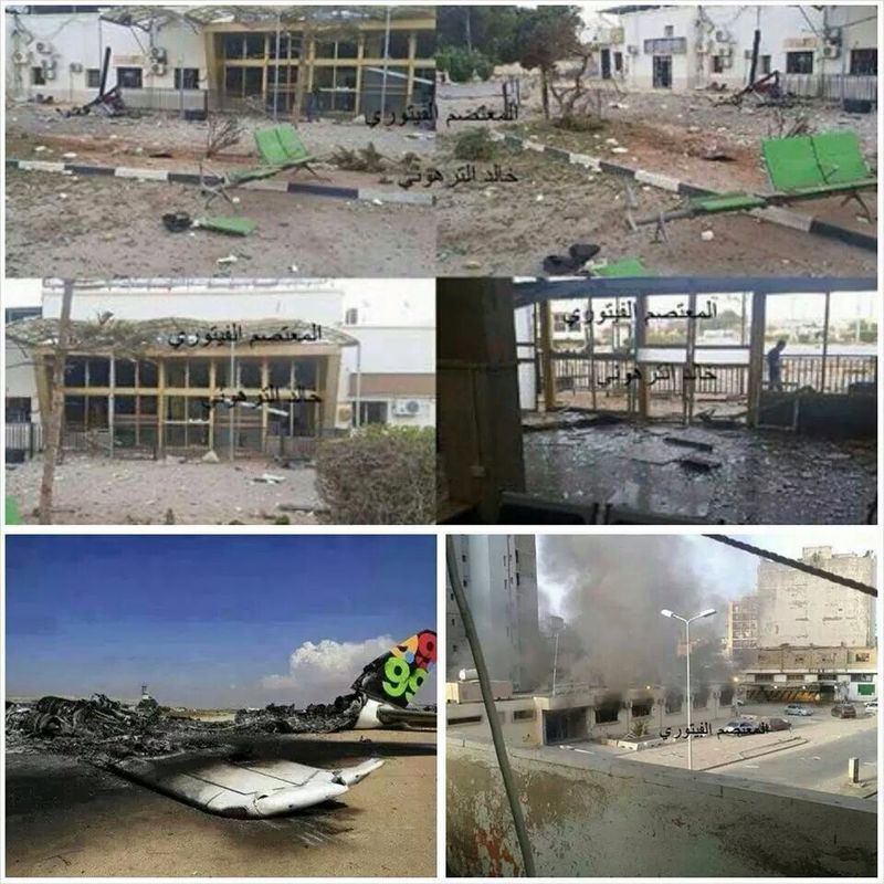 Aviones reducidos a cenizas en el aeropuerto, esqueletos de edificios rezumantes de humo negro, ventanas huérfanas de cristales, son sólo algunas de las muestras del horror que se vive hoy en Libia. Algunas fotografías enviadas por Mercedes Fonte muestran fachadas y muros repletos de agujeros provocados por disparos de metralla y lanzamientos de misiles “hawk”. Otras enseñas las heridas que dejan los escarceos entre el ejército leal al general sublevado Jalifa Hafter (quien pretende crear un gobierno de concentración para estabilizar la volátil situación del país) y las milicias religiosas. Decenas de boquetes en bloques de pisos de civiles y en calles y carreteras.