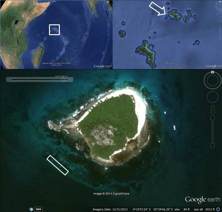 MAPA COMPUESTO DE LAS SEYCHELLES. En la imagen ampliada se aprecia la isla de Cousin, la reserva natural en donde se sitúan los viveros de coral y el arrecife trasplantado. Copyright: Google Earth