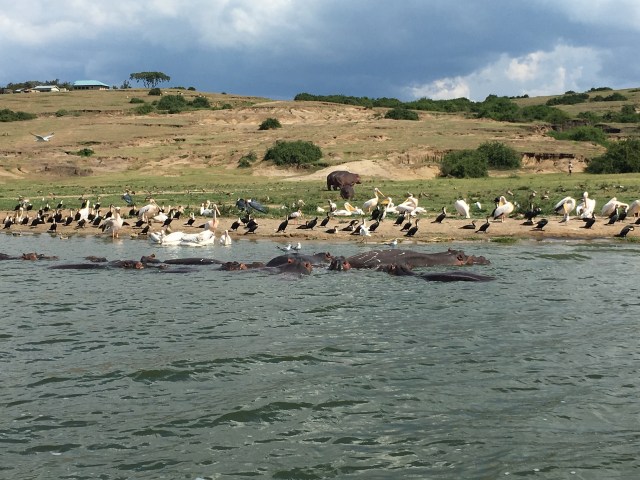 Hay unos 2.000 hipopótamos. Muchos se concentran en los márgenes, en grupos de 8 o 10 para descansar en el agua. Permanecen unos encima de otros, apelotonados. La escena se compone con otros tantos búfalos en la orilla y en tierra firme, y decenas de pájaros de vistoso plumaje. El agua verdosa de este canal también aloja cocodrilos de tamaño mediano que normalmente comen peces. La vida se abre camino en el Parque Nacional Queen Elizabeth.
