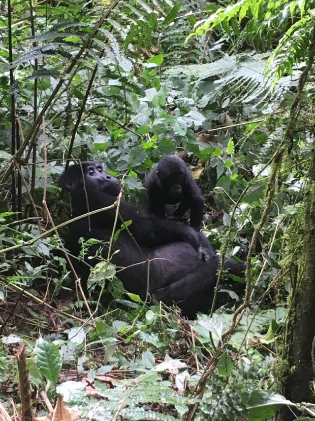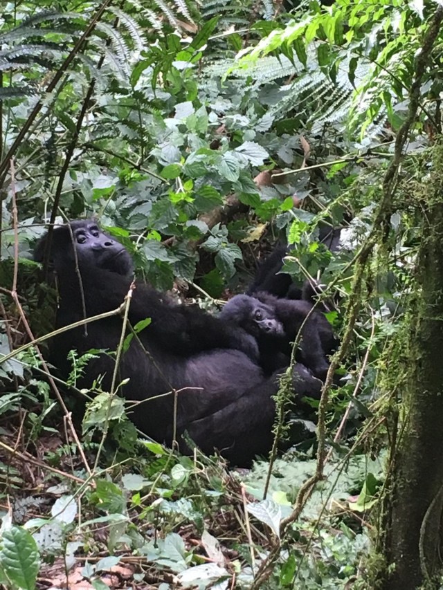Lo primero que oí fue el susurro ahogado “están ahí”, de una azafata de vuelo de Barcelona que también hacía la excursión con nosotros (el “tracking” de gorilas). Un inmenso gorila macho de espalda plateada se mecía entre los arbustos y la hierba, mientras se sentaba relajado en el suelo. A su lado, una cría de unos seis meses, revoloteaba dejando ver sus grandes ojos en medio de una nube de pelo negro.