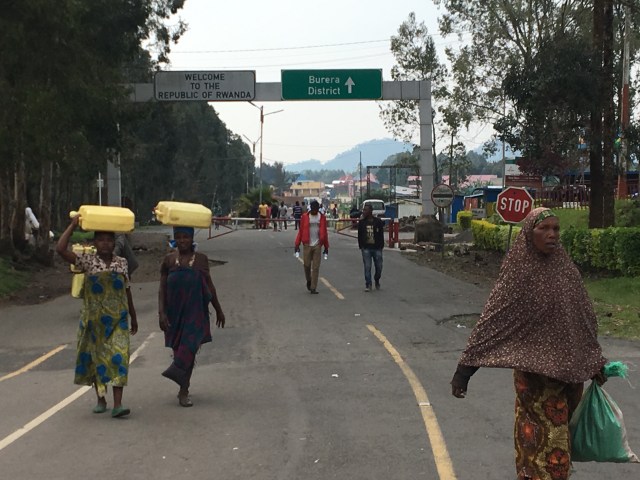 Varias personas cruzan de Rwanda a Uganda en la frontera de Cyannika.