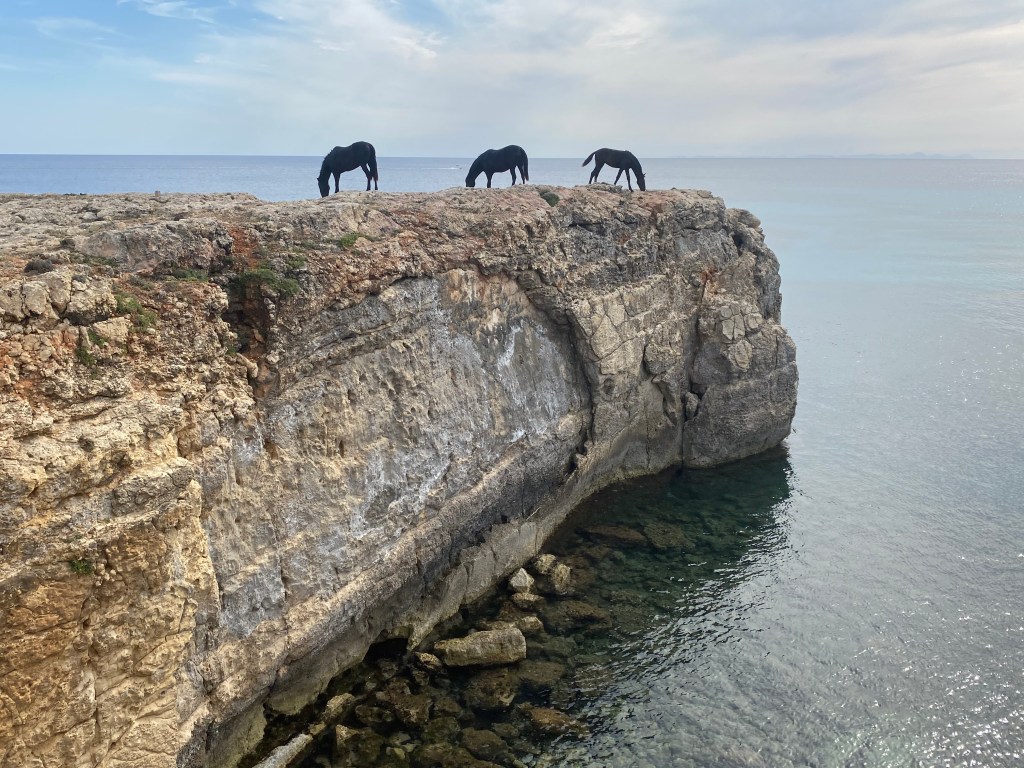 Bien entrada la tarde, cuando el sol empieza a aflojar, los caballos de una finca cercana a la playa de Atalis (sur) salen del terreno, traspasan el «camí de cavalls» y se acercan al precipicio en busca de tallos de hierba salada.