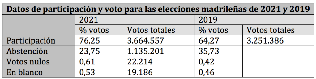 Tabla1: Elaboración propia a partir de los datos extraídos de: https://resultados2021.comunidad.madrid/Resultados/Comunidad-Madrid/0/es