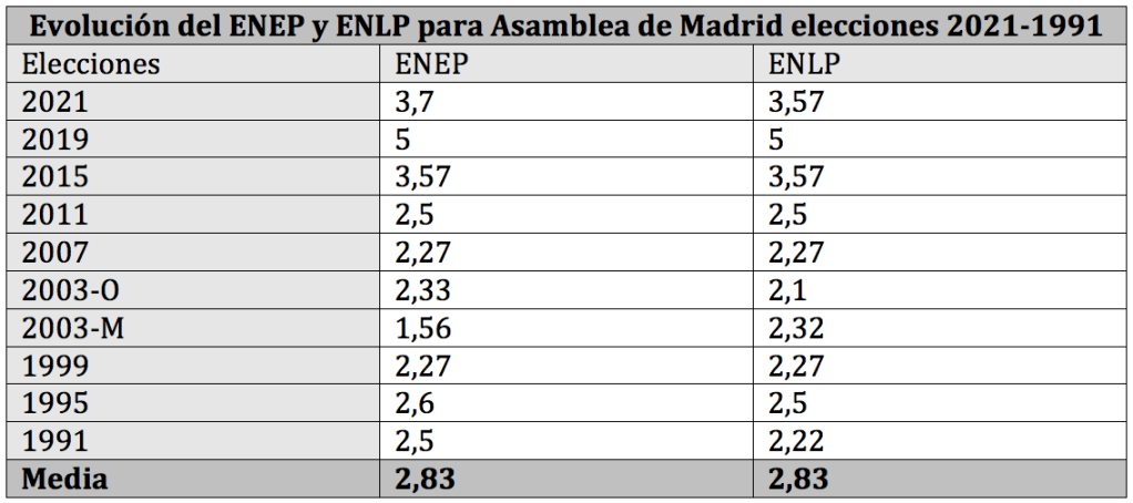 El sistema de partidos madrileño se caracteriza por un nivel de fragmentación relativamente bajo. Tal y como hemos visto anteriormente, la media del número efectivo de partidos electorales (ENEP) y la del número efectivo de partidos legislativos (ENLP) es la misma (2,83) para los comicios celebrados entre 2021 y 1991, ambos años incluidos. Aunque observamos como la tendencia a partir de 2015, y para las elecciones siguientes hasta las últimas en 2021, la tendencia es hacia un aumento tanto del ENEP como del ENLP. Ese sería el resumen a grandes trazos. Antes de desarrollarlo un poco más, podemos empezar por comprobar como los dos indicadores se solapan en la mayoría de ocasiones (se obtiene la misma magnitud), mientras que en tan solo tres elecciones (1991, 1995 y 2003-Octubre) el ENEP es superior al ENLP. Normalmente hay un número mayor de partidos electorales que luego el número de partidos legislativos a tener en cuenta. Aunque, como vemos, para el caso madrileño ambos índices coinciden bastante.