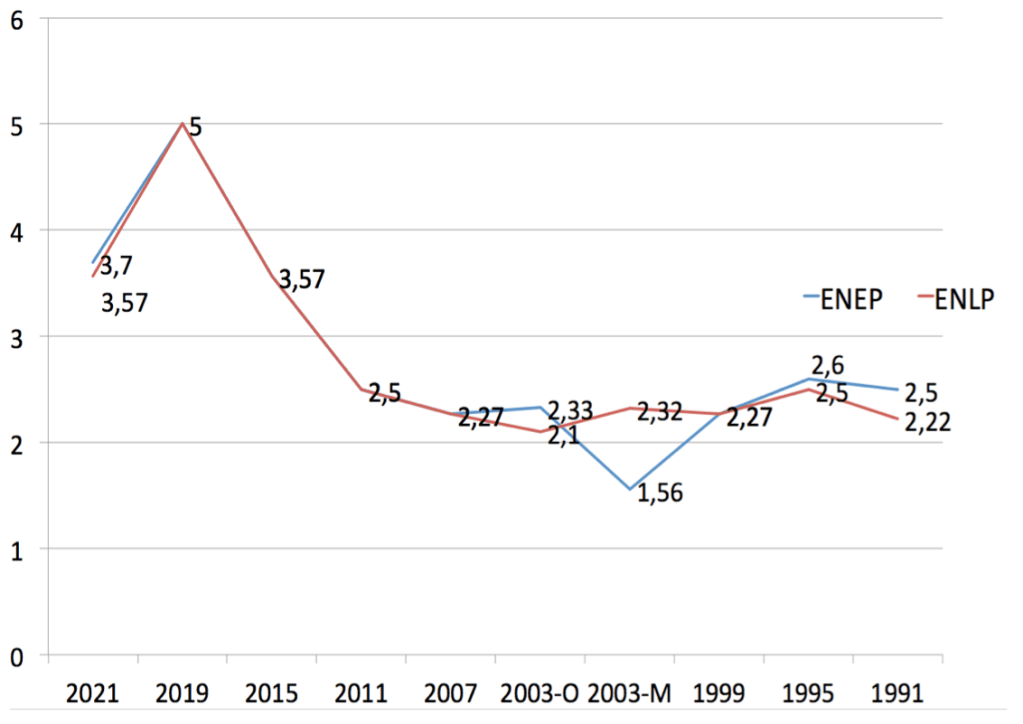 A continuación paso a reproducir el gráfico en el que se aprecia la evolución de ENEP y ENLP para las elecciones madrileñas en el periodo analizado (2021-1991).