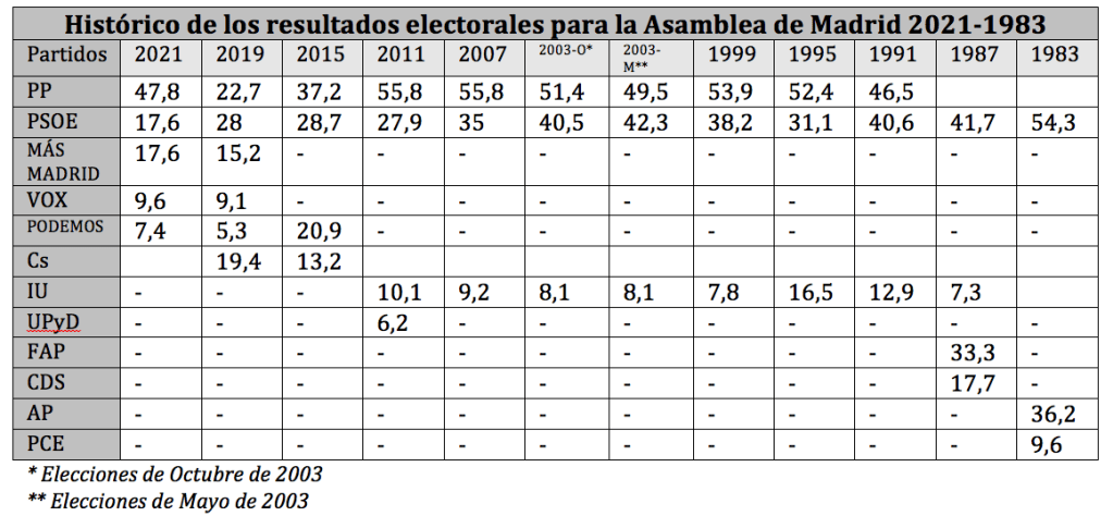 El sistema madrileño de partidos ha experimentado cambios a partir de las elecciones de 2011, pero aun más, con los comicios de 2015, cuando se produce un punto de inflexión. Aparecen nuevos partidos que como UPyD, CIUDADANOS, PODEMOS y MÁS MADRID, que consiguen representación parlamentaria. De ser un sistema bipartidista, -o de dos partidos y medio (PP-PSOE e IU), con el PP como partido hegemónico durante casi dos décadas-, se ha convertido en sistema multipartido moderado con un cierto predominio del PP. Como consecuencia de la entrada de nuevas formaciones aumenta la fragmentación electoral y también la volatilidad entre partidos y en cada uno de los dos bloques ideológicos, sobre todo en el de la izquierda (no tanto en la volatilidad intra bloques). Eso también ha impreso cambios en el sistema, sobre todo en el patrón de competencia, introduciendo la coalición como nueva forma de gobierno en la comunidad (PP-CIUDADANOS en 2019. Por último, la polarización ideológica, fruto del clivaje de clase social, atizado en las últimas elecciones del pasado 4 de mayo, tanto por Ayuso, como por Iglesias, ha beneficiado a la líder popular, que ahora ve como la única coalición posible es con la ultraderecha de Vox. Aunque no es esta su única opción para gobernar la comunidad de Madrid, durante los próximos dos años.