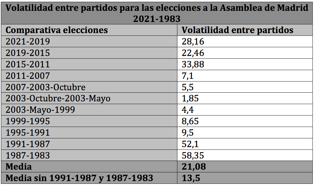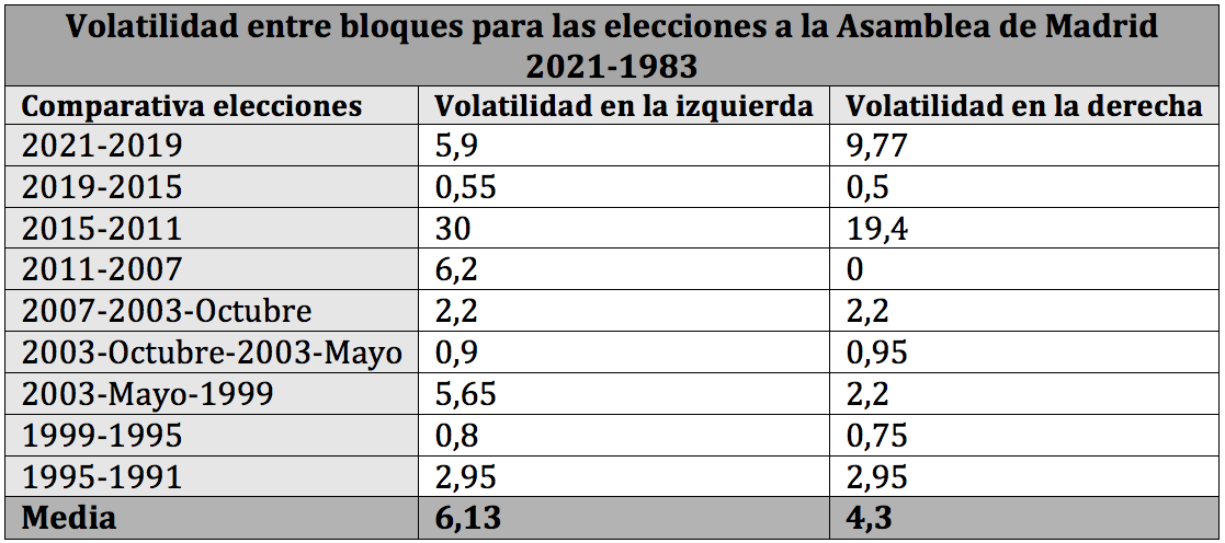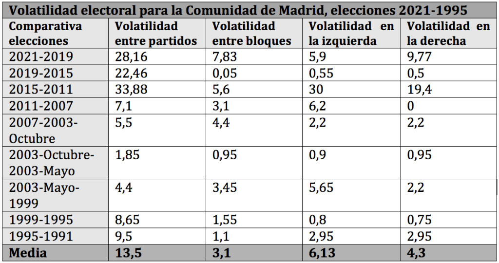 En resumen, el sistema de partidos madrileño se caracteriza por una cierta estabilidad en cuanto a que la volatilidad entre bloques ideológicos es baja. Esta se sitúa en una media de 3,1 puntos. Es decir, no hay grandes trasvases de votantes de un bloque a otro. También, se ha determinado que existe una mayor volatilidad para el bloque de izquierdas (6,13) que para el de derechas (4,3). Por último, si bien es cierto que a partir de 2003, -con la desaparición de partidos como AP, el CDS, la FAP o el PCE, y el advenimiento del PP, PSOE e IU como principales partidos madrileños-, el sistema gozó de una mayor estabilidad en términos de una volatilidad de los partidos que se situaba en torno a 5 puntos, en 2015 se produjo un punto de inflexión, -debido a la aparición de nuevos partidos como PODEMOS, CIUDADANOS, y más adelante VOX y MÁS MADRID-, y es cuando la volatilidad tocó techo con valores que oscilan entre los 33,88 puntos en los comicios de 2015, para descender hasta los 28,16, en las últimas elecciones del pasado mes de mayo. En definitiva, el sistema madrileño es algo más inestable en cuanto a la volatilidad de partidos, no así en cuanto a la volatilidad entre bloques ideológicos e intra bloques.