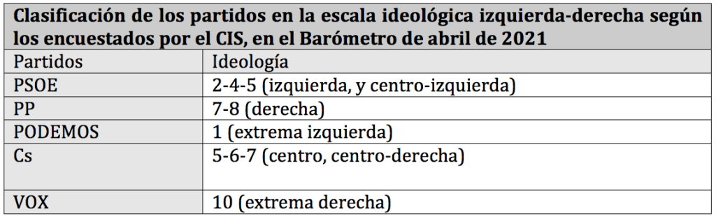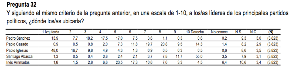 La volatilidad electoral también puede calcularse en relación con bloques ideológicos, de izquierda y de derecha. Y la manera de calcular esta nueva magnitud es la misma que con el índice de volatilidad electoral de los partidos, con la diferencia que el sumatorio de los subtotales se hace por separado. Uno primero para los partidos de izquierda o centroizquierda, y otro para los partidos de derecha o centro-derecha. Bien, para empezar a operar deberemos situar en el eje izquierda-derecha a los principales partidos que estuvieron en liza en las últimas elecciones madrileñas. Para ello utilizaremos datos extraídos del Barómetro del CIS de abril de este año. Nos interesa conocer en qué espacio del eje ideológico, a ojos de los encuestados, se colocan los diferentes partidos políticos. Y para ello recogeremos los resultados de la pregunta 32 del CIS (2021) en donde se pide ubicar a los líderes nacionales de la mayoría de los partidos que se presentaban a los comicios madrileños (con la excepción de MÁS MADRID). Entendemos que al ser líderes de sus formaciones a nivel estatal, la ubicación ideológica que los encuestados otorguen a cada uno, se puede extrapolar a su partido a nivel regional. Y también entendemos que la ubicación ideológica será compartida tanto para el partido a nivel estatal, como autonómico. Del caso de MÁS MADRID nos ocuparemos luego. Pasamos a reproducir la pregunta extraída del CIS en la tabla número 7.