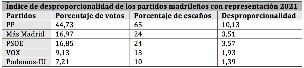 A partir de la tabla anterior, pasamos a ordenar los partidos que han registrado de desproporcionalidad, de mayor a menor: PP (11,3%), MÁS MADRID (3,51%), PODEMOS-IU (3), CS (2,6%), PSOE (2,5%), VOX (1,93%), UPYD (0,9) e IU (0,5%).