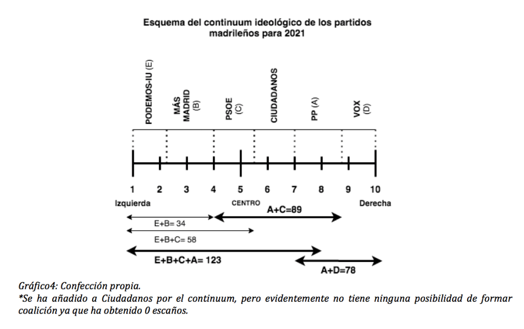 La estrategia de polarización le ha funcionado más a Ayuso que a Iglesias, como se ha podido comprobar. La alta participación (más del 76%) logró mejorar tímidamente los resultados de PODEMOS-IU, llevó al PP madrileño a casi alcanzar la mayoría absoluta. Por no decir que ha dejando al PSOE lamiéndose las heridas, digiriendo todavía su peor resultado electoral y, al mismo tiempo, ha reafirmado la fortaleza de MÁS MADRID, como alternativa de izquierdas en la comunidad. Ahora el futuro de la Asamblea depende de las negociaciones entre Ayuso y VOX. Los de ultraderecha son el único compañero posible de viaje, teniendo en cuenta la línea ideológica de conflicto y después de certificarse la debacle en CIUDADANOS. Como ya he apuntado en el primer ejercicio, Ayuso puede liderar un gobierno fuerte en solitario con el apoyo externo de VOX, o puede hacer entrar a los de Rocío Monasterio en un gobierno de coalición, que en cualquier caso coincidiría con el modelo combinado de coalición mínima conectada Axelrod-Leiserson.