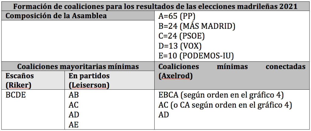 Como ya hemos adelantado, un gobierno a dos no sería la opción preferida para Ayuso, pero si finalmente se llegara a un pacto de coalición con VOX, en ese caso podríamos determinar de qué tipo sería, en función de lo expuesto en los ejercicios anteriores. Dado que la formación de la coalición PP+VOX consta del mínimo de partidos posibles pero no del mínimo de escaños, podemos descartar que se trate de una coalición ganadora mínima en escaños de Riker (puesto que habría una alternativa de coalición formada por MÁS MADRID, PSOE, PODEMOS y VOX, que sumarían 71 escaños, siete menos que la formada por PP y VOX), y al mismo tiempo podemos afirmar que se trata de una coalición ganadora mínima en partidos de Leiserson (dado que es una de las alternativas a dos partidos que superan la mayoría absoluta). Por otra parte, la coalición PP-VOX encajaría con la opción combinada del modelo de Axelrod y del modelo de Leiserson (coalición mínima conectada y coalición formada por el mínimo número de partidos posible).