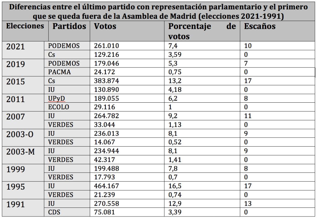 Finalmente, para el resto de elecciones, las diferencias entre el último partido con escaños y el que se queda a las puertas es significativamente mayor que en los dos ejemplos anteriores. Por ejemplo, sin irnos muy lejos, para las elecciones de 2019, el PACMA se queda fuera del arco parlamentario madrileño al haber atesorado 7 veces menos cantidad de votos que el último con participación, en este caso PODEMOS. En 2011, la diferencia en votos llegó a ser de 6,4 veces, entre el último con representación y ya el primero que se quedó fuera. Esa proporción se disparó hasta más de 16 veces en las elecciones de 2003 de octubre entre Izquierda Unida y Los Verdes.