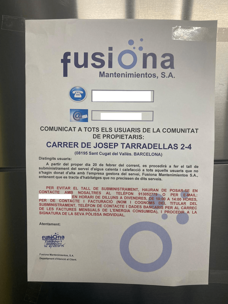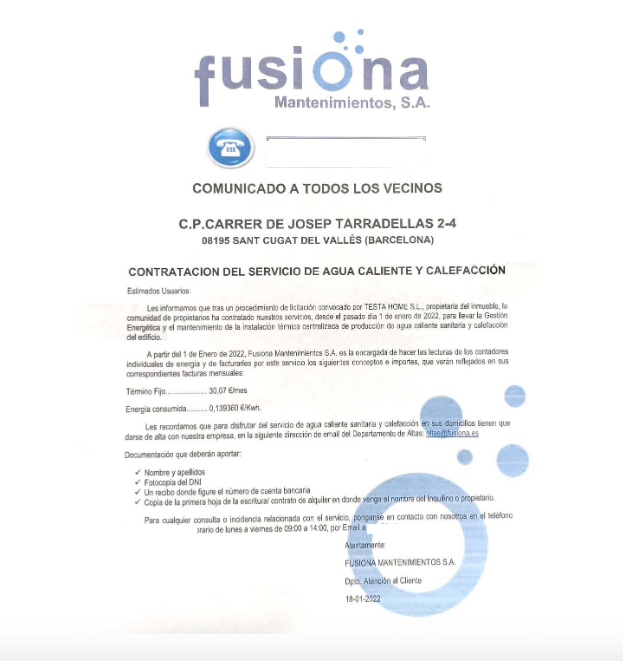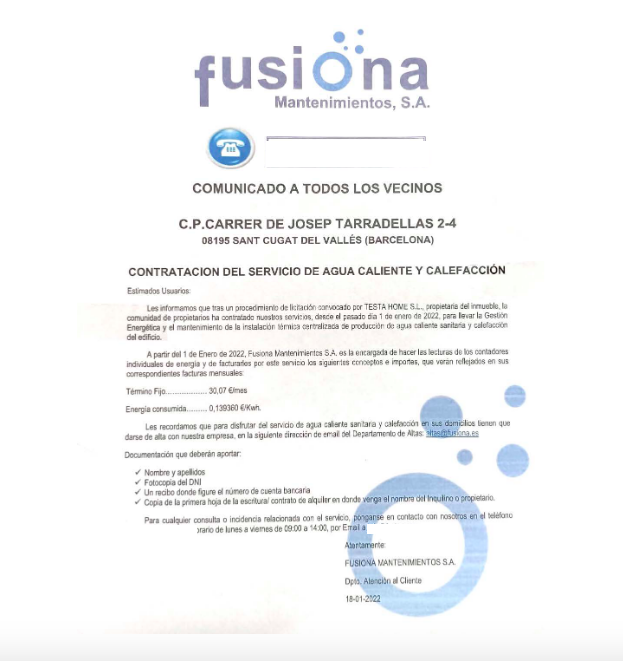 De un día para otro, el pasado 18 de enero, los más de 170 inquilinos de seis fincas de protección oficial de Sant Cugat del Vallès, encontraron en el ascensor una nota inquietante. Una desconocida empresa llamada FUSIONA Mantenimientos S.A. comunicaba que había ganado una licitación para llevar la gestión energética y el mantenimiento de la instalación térmica centralizada. Y especificaba que, de forma retroactiva, a partir del primer día de enero de este año pasaba a suministrar la producción de agua caliente sanitaria y calefacción. En esa misma hoja, -sin previo aviso de ENERGEA Ingeniería en eficiencia energética, empresa que hasta el momento había dado el servicio-, se instaba a todos los vecinos a entrar en una dirección web para darse de alta en la nueva suministradora si querían seguir “disfrutando del servicio de agua caliente sanitaria y calefacción”.
